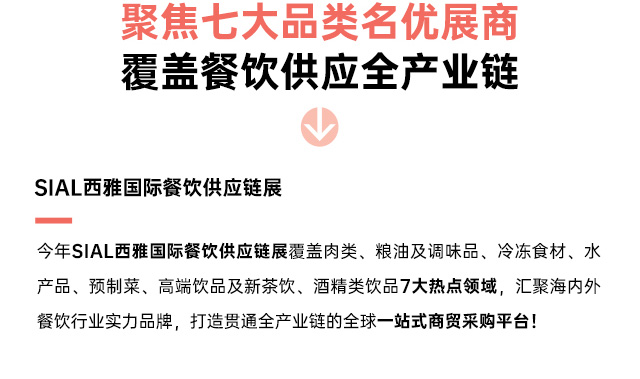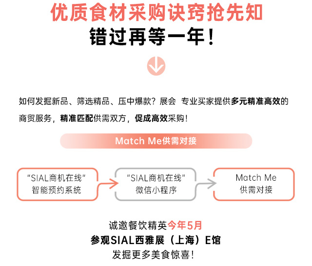 穩定可靠的高品質食材供應鏈,已經成為餐企健康發展的關鍵支撐。今年SIAL西雅展(上海)將同期舉辦SIAL西雅國際餐飲供應鏈展,屆時E館將匯聚全球優質食材,為餐飲人士提供更多采購選擇!