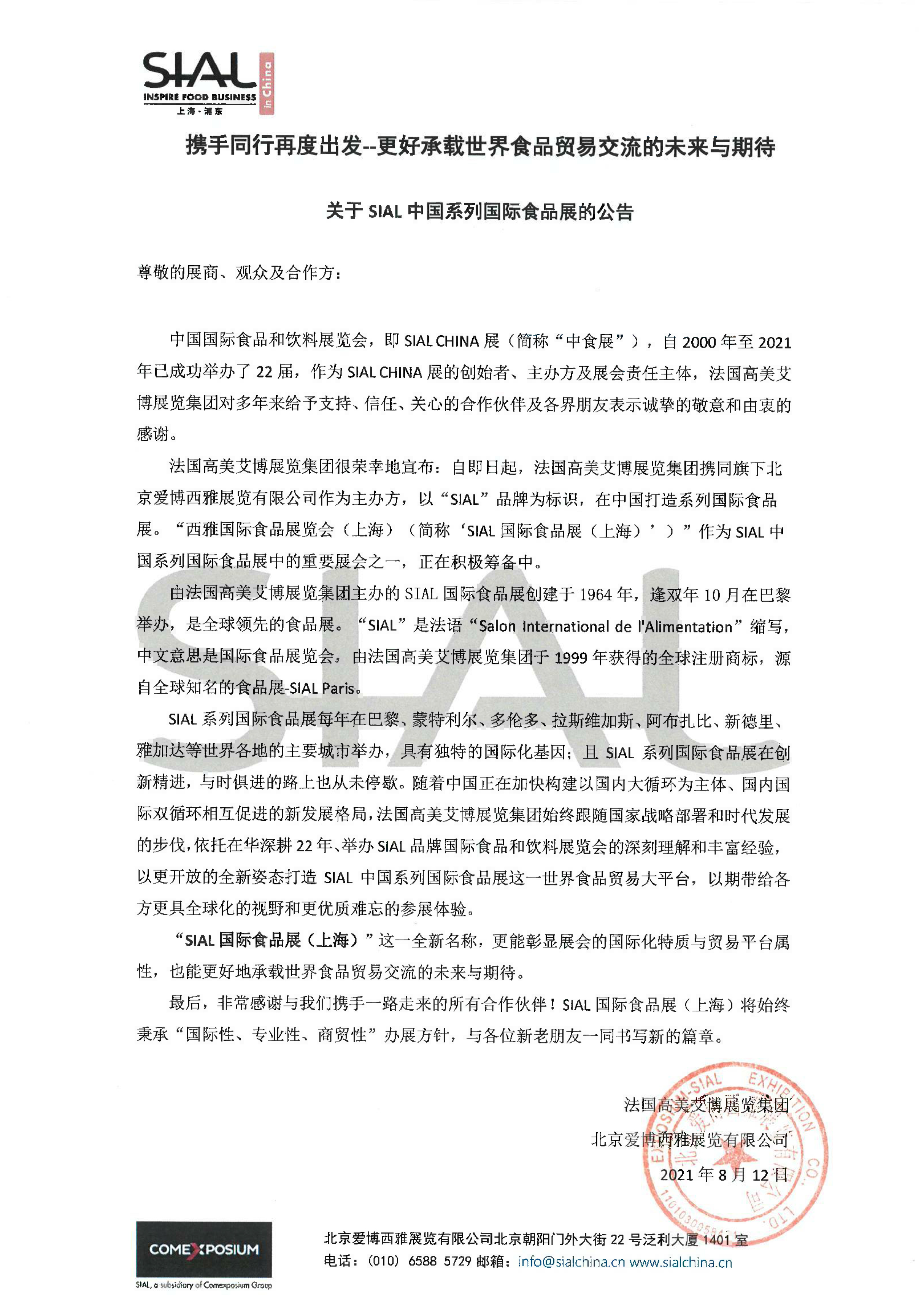 攜手同行再度出發--更好承載世界食品貿易交流的未來與期待 關于SIAL中國系列國際食品展的公告